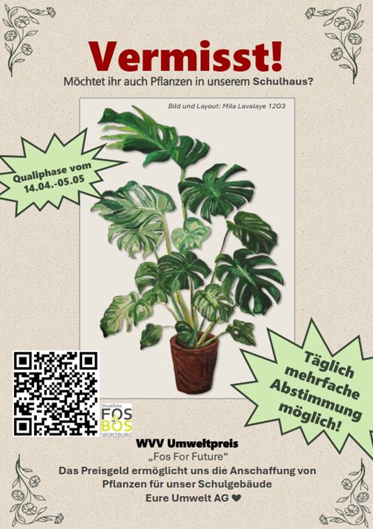 Mit dem möglichen Preisgeld wollen wir unsere Gesprächsecken im Schulgebäude verschönern und eine richtig angenehme, grüne Atmosphäre schaffen.