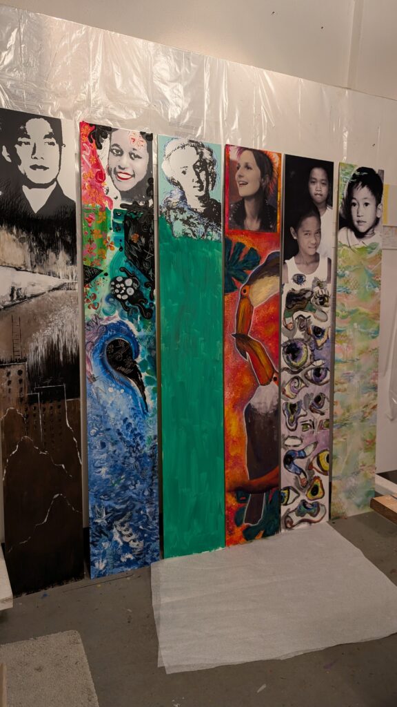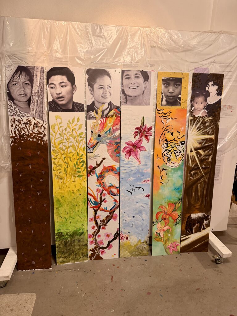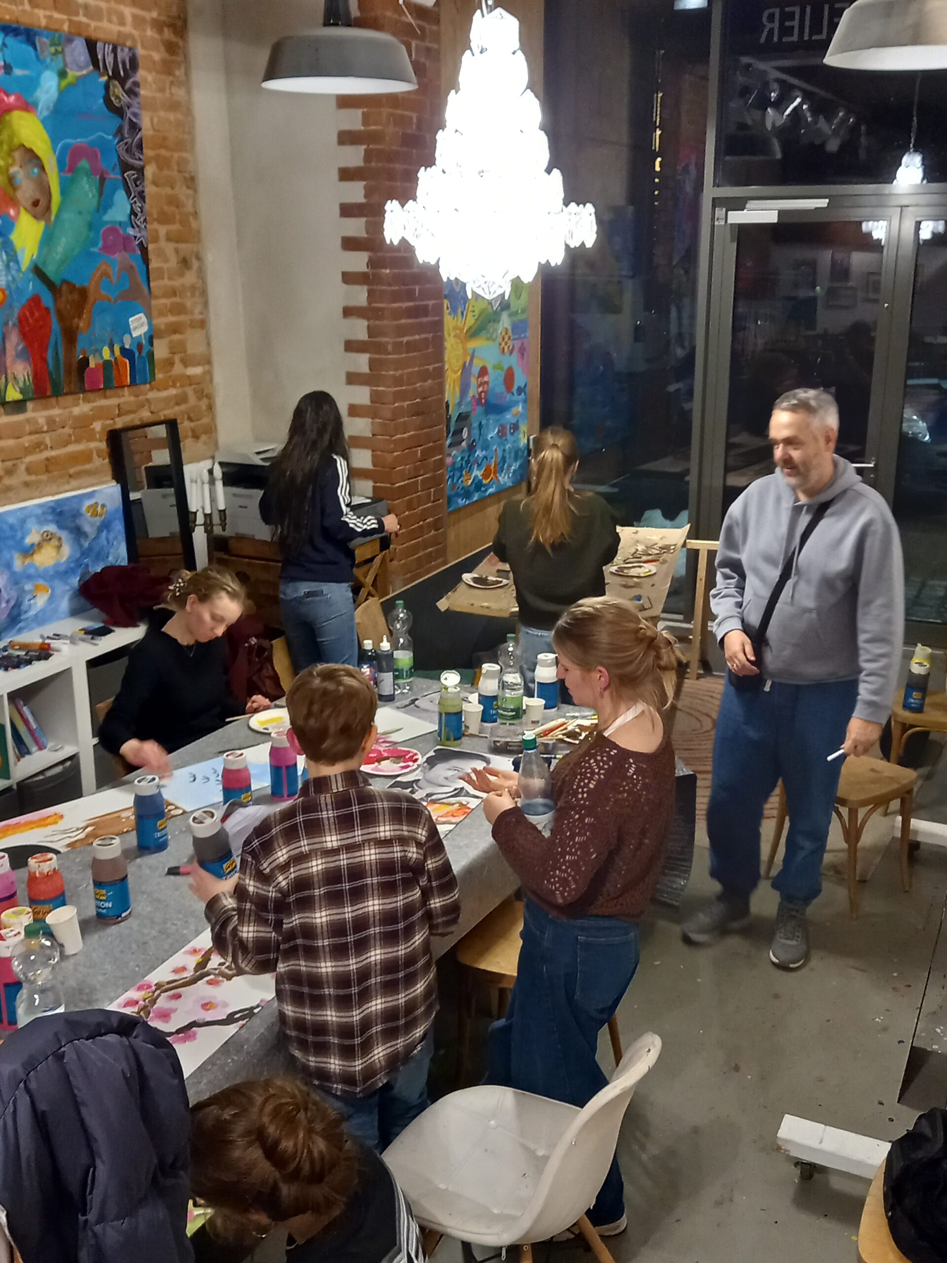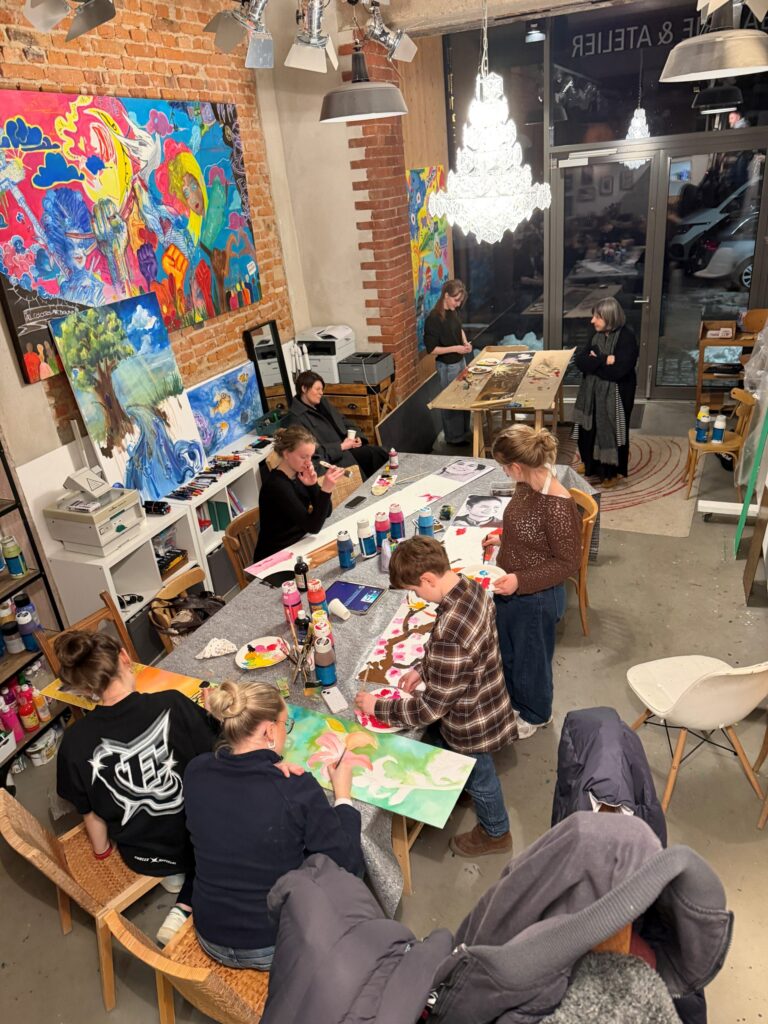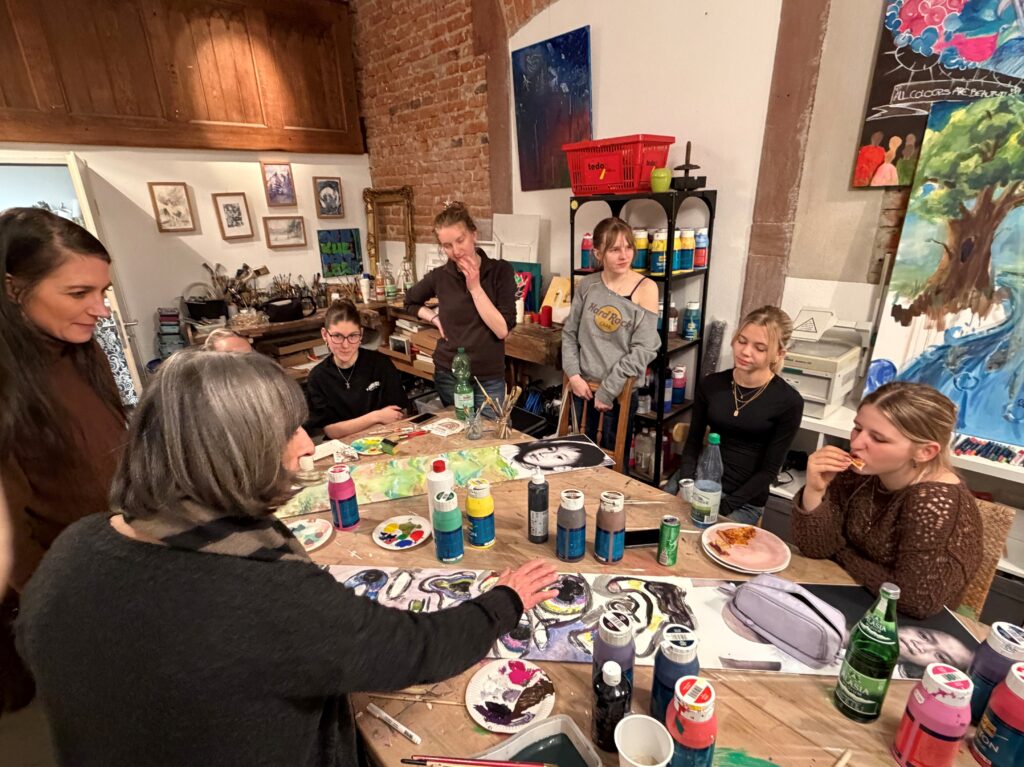 Schülerinnen der 13. Klasse Gestaltung und zwei Lehrkräfte trafen sich an zwei Abenden im Atelier der Inklusiven Akademie auf dem Bürgerbräu-Gelände. Ziel war es, sechs Stelen für das Ausstellungsprojekt „366“ der geschätzten Künstlerin Gerda Enk beidseitig zu gestalten. Dieses wird als nächstes zwischen dem 22.2. und dem 22.3.2026 in Erfurt zu sehen sein – weitere Stopps sind geplant. Finanziert wurden die Abende dankenswerterweise durch das wertvolle Projekt „KuBiKo“ des Bildungsbüros der Stadt Würzburg. Die Vermittlung zwischen Schule und Künstlerin übernahm dabei die für die Würzburger Schullandschaft nicht minder wertvolle Inklusive Akademie unter der Leitung von Frau Isabel Gräf, die der Klasse Raum, Material, Zeit und nicht zuletzt unendlich viel Wärme und Begeisterung zur Verfügung stellte – das perfekte Setting, um Kreativität zur vollen Entfaltung zu bringen. Zwei Abende voller Kunst, voller intensiver Gespräche, voller nachwirkender Eindrücke und nicht zuletzt zwei Abende mit tollen Ergebnissen.