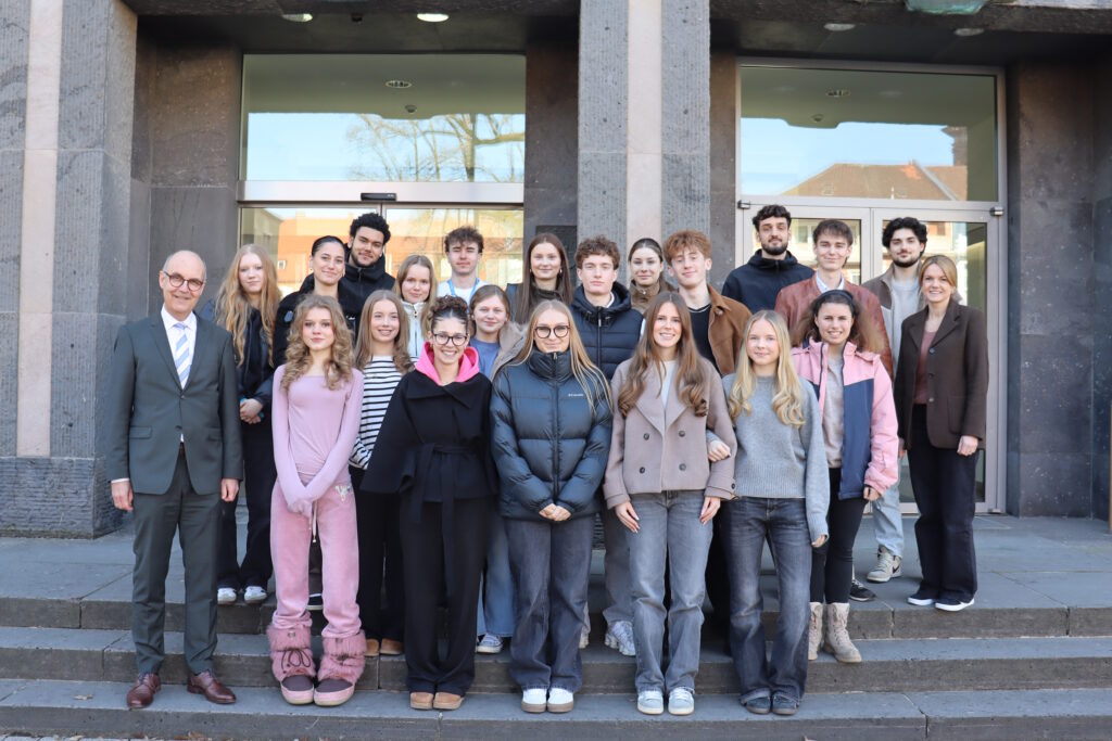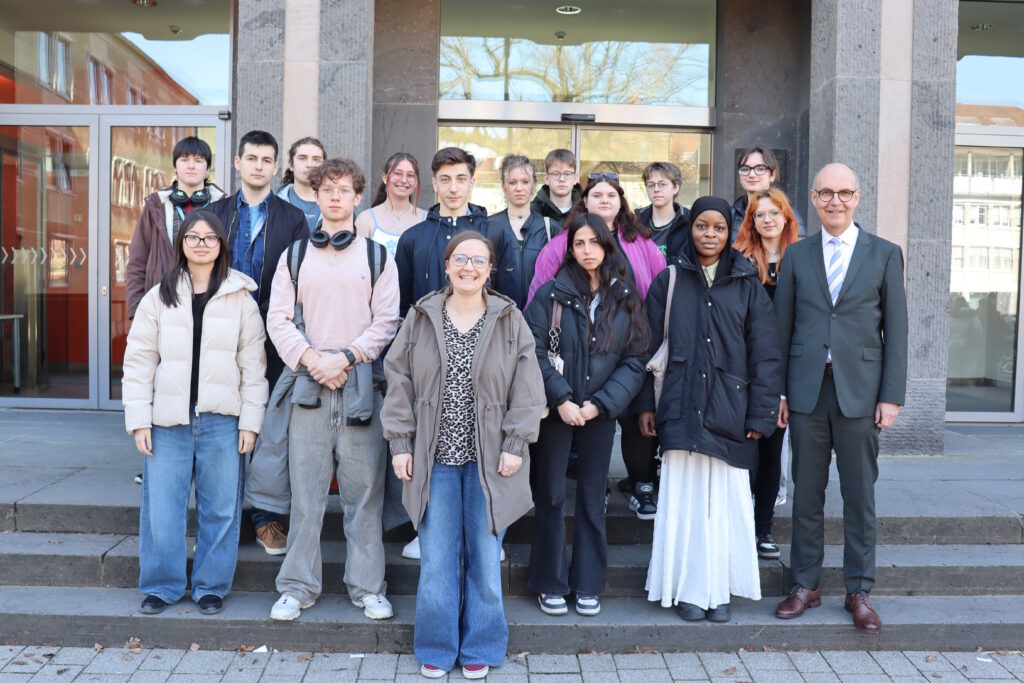 Im Anschluss daran fand ein Grundsatzreferat zum Thema „Direkte Bürgerbeteiligung auf kommunaler Ebene“ von Herrn Müller statt. In diesem Vortrag wurde erklärt, wie Bürgerinnen und Bürger in Städten und Gemeinden an politischen Entscheidungen beteiligt werden können, beispielsweise durch Bürgerbegehren oder Bürgerentscheide. Dabei wurde auch anhand von Gesetzestexten und realistischen Beispielen wie das Bürgerbegehren zum „Kostenlosen Parken auf der Talavera“ erläutert, welche Bedeutung solche Beteiligungsmöglichkeiten für die Demokratie auf kommunaler Ebene haben. Zum Abschluss wurden wir vom Vizepräsidenten Jochen Lange empfangen. Dieser nahm sich erfreulicherweise nochmals Zeit für uns, so dass wir noch einmal die Möglichkeit hatten, Fragen zu stellen und mehr über die Arbeit der Regierung von Unterfranken zu erfahren. Besonders interessant waren für uns die offenen persönlichen Erfahrungen und Eindrücke. Abschließend vergab Herr Lange den Preis für das Quiz und war am Ende auch noch dazu bereit, mit einigen von uns Selfies zu machen.